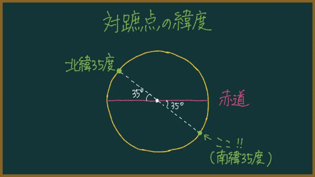 つまり、東京(北緯35度、東経139度)の対蹠点の緯度は「南緯35度」。