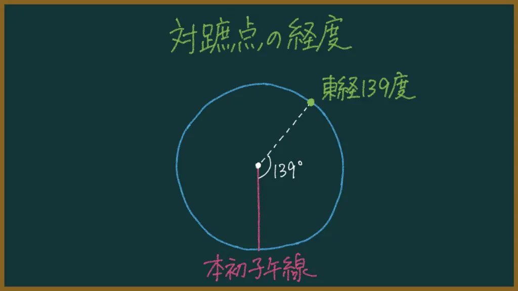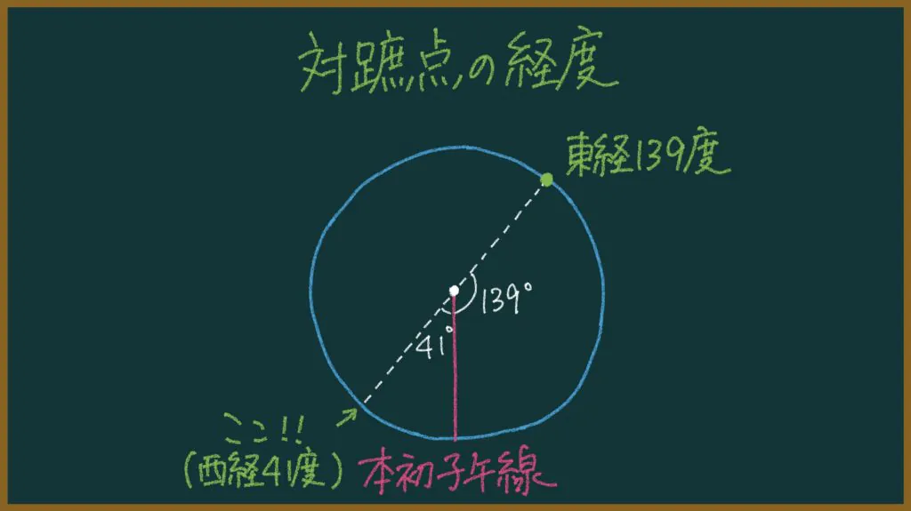 となります。つまり、東京(北緯35度、東経139度)の対蹠点の経度は「西経41度」。