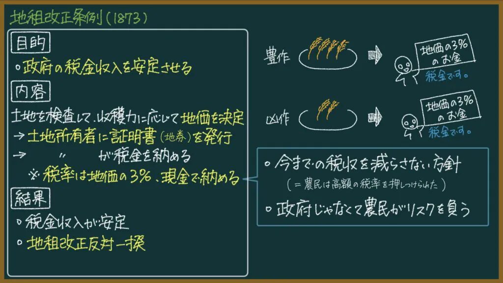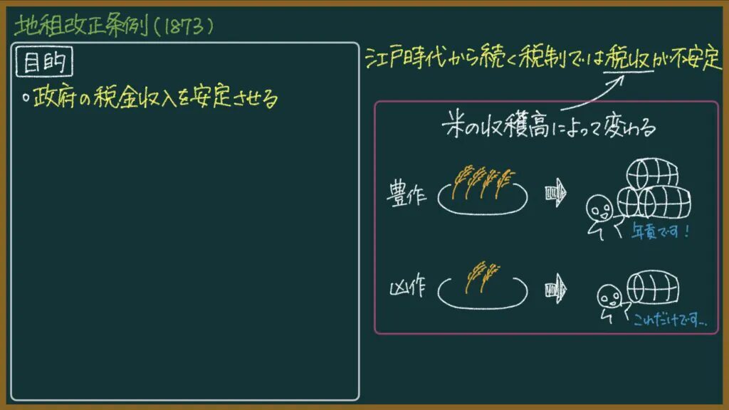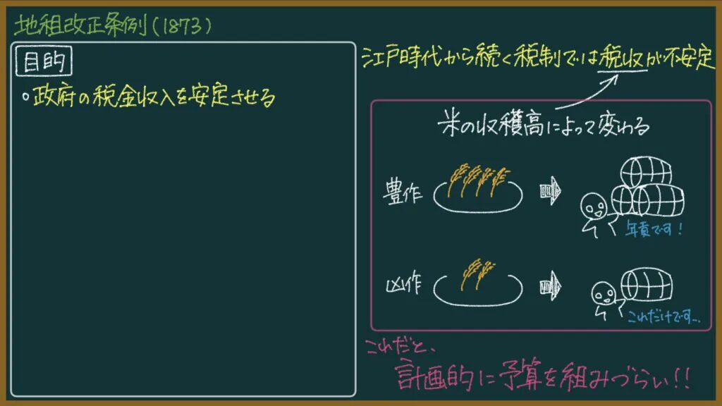 地租改正の目的は「明治新政府の税金収入を安定させること」でした。
