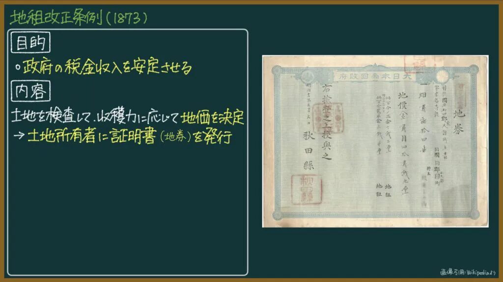 =江戸時代は土地を売ったり買ったりしてはいけないことになっていたけど、それを許可しました。そして、地券を発行して土地の所有権をはっきり認めました。