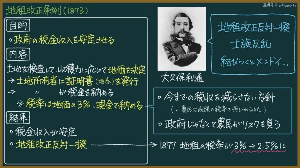 この結果、1877年には地租の税率が3%から2.5%に引き下げられることになりました。