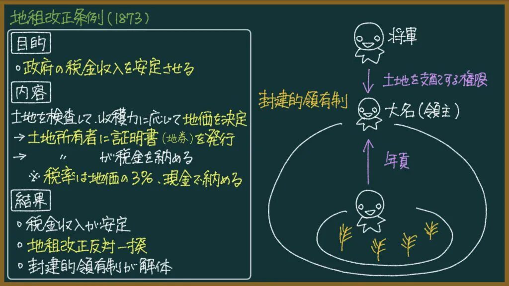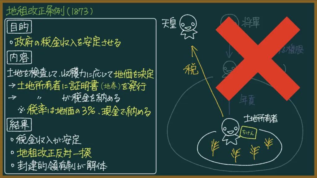 それまでの「将軍が大名などに土地を支配する権限を与えて、領主(大名など)がその土地と人々を管理し、その土地の人々は領主(大名など)に年貢を納める」っていう、本当の所有者がよくわからない複雑な仕組み(封建的領有制)が解体されました。