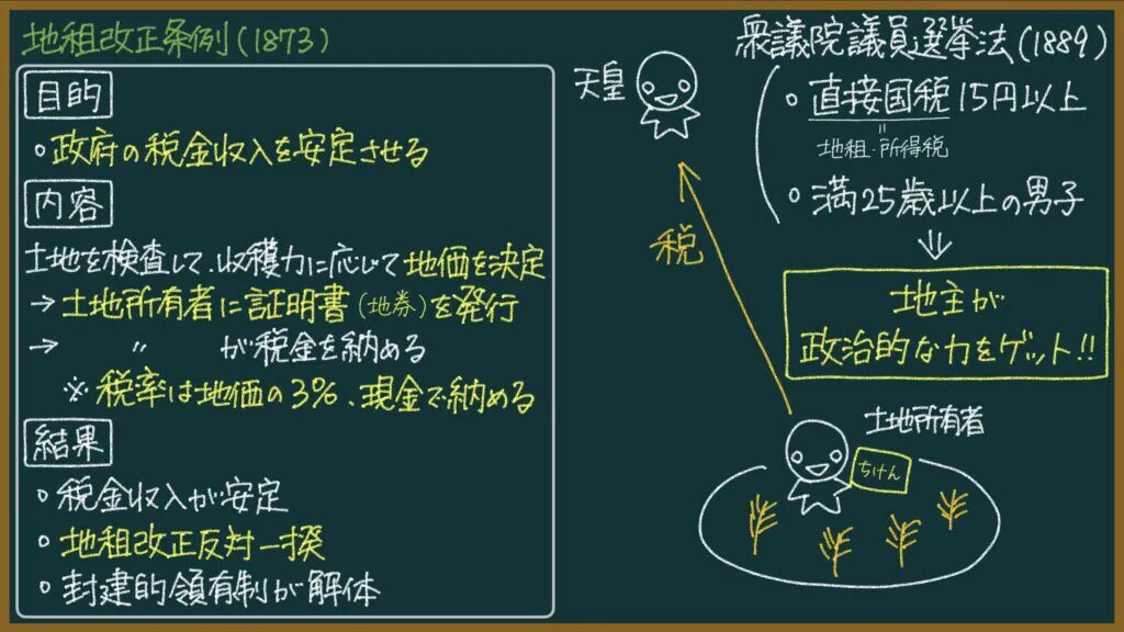 ※ちなみに、1889年に制定された衆議院議員選挙法では、直接国税(=地租、所得税)を15円以上納めている満25歳以上の男子が有権者とされました。なので、地租改正によって土地所有者(=地主)が納税義務者となったことは、のちのち地主が選挙権を持って、地主が政治的な力を獲得することをもたらしたと言えると思います。