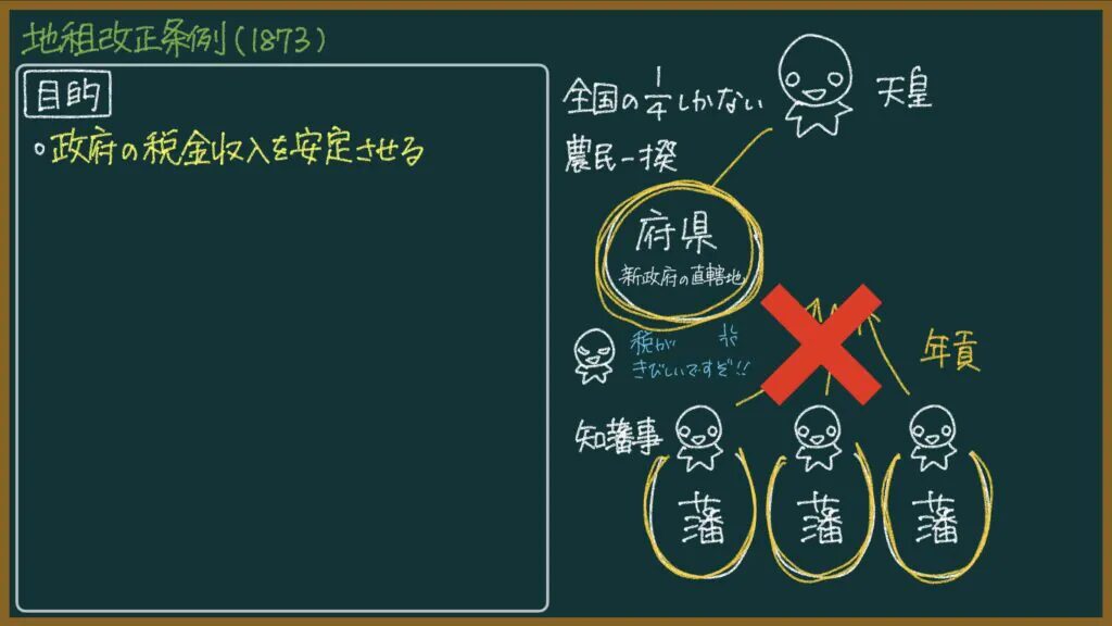 廃藩置県の前までは、日本各地の藩も年貢を集める権利を持っていて、その年貢は新政府に納められるわけではありませんでした。