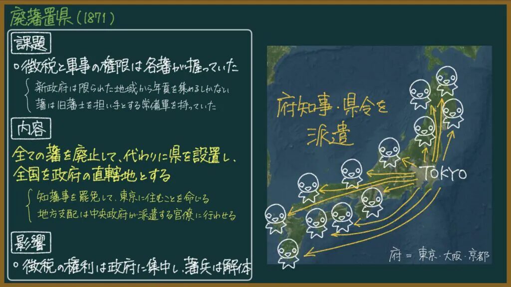 ですが、思い切って廃藩置県を行った結果、日本各地から税金を集める権利は明治新政府に集中することになりました。