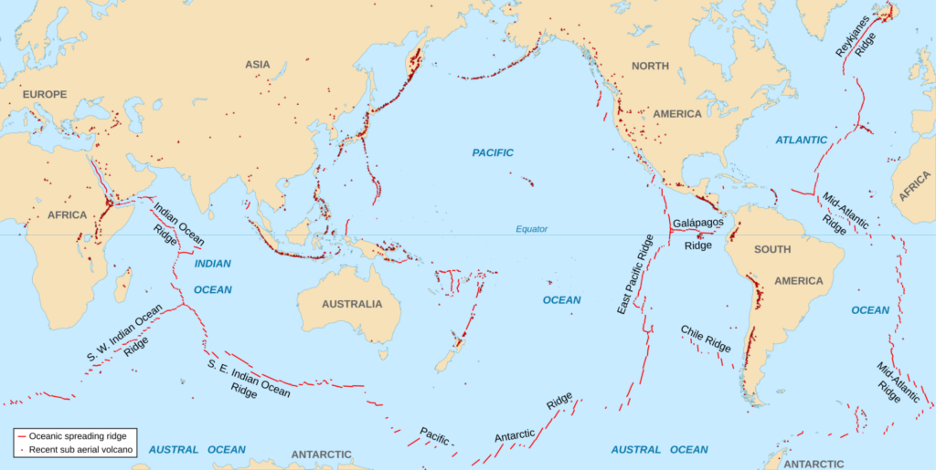 地中海はユーラシアプレートとアフリカプレートの境界。イタリア南部やギリシャ周辺では、アフリカプレートがユーラシアプレートの下に沈み込んでいる。これがイタリアの火山活動(エトナ山など)や、地中海東部の地震活動の主な原因となっている。