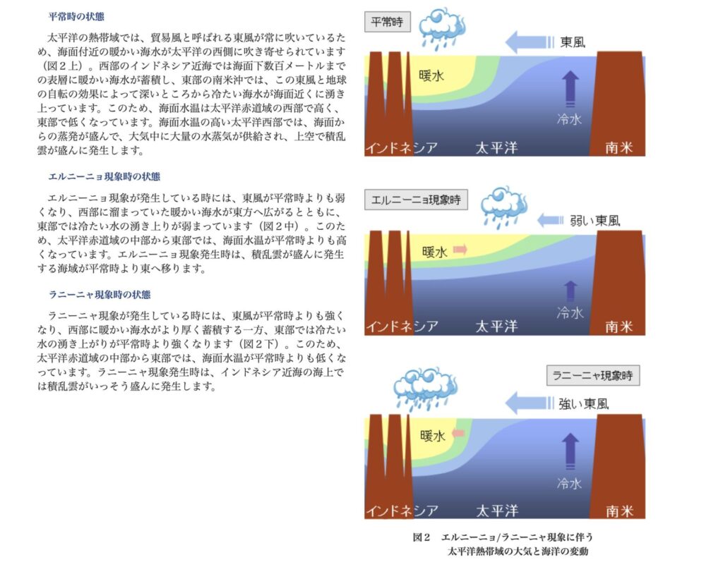 これらは合わせて「エルニーニョ・南方振動(ENSO)」と呼ばれる大規模な気候変動システムの一部であり、数年ごとに繰り返す「通常の変動の範囲内」の現象と言える。