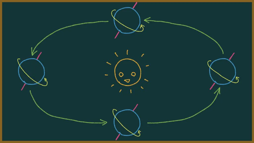 なので、地球が自転しながら太陽の周りを公転する様子を図で示すと、こんな感じになります↓