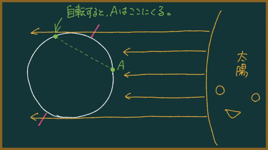「A」の地域は、地球が自転すると太陽の方を向いていない(太陽に照らされない)時間帯があるのが分かります。