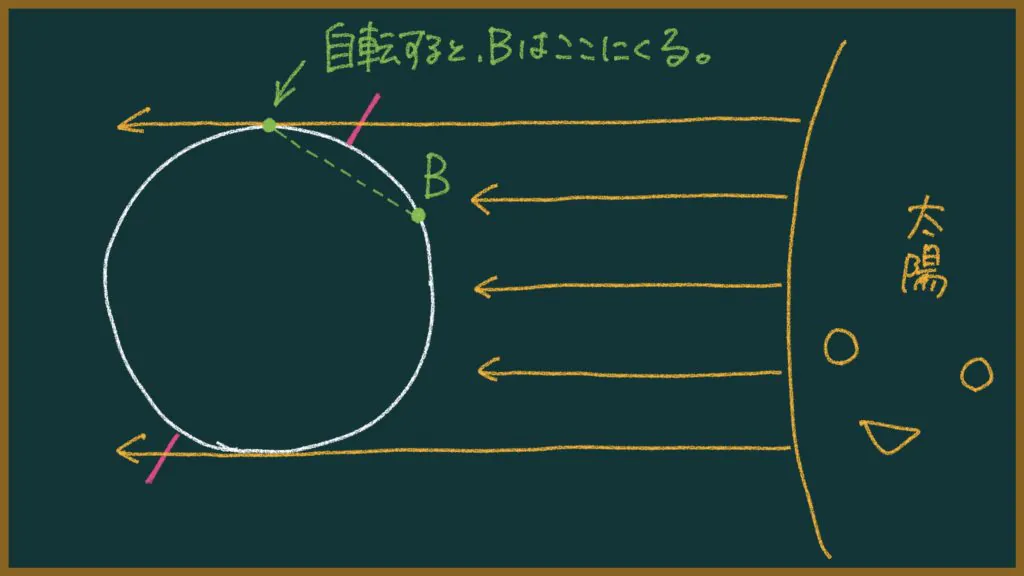 一方、高緯度の地域である「B」の地域は、地球が自転しても常に太陽の方を向く(太陽に照らされる)ことになります。