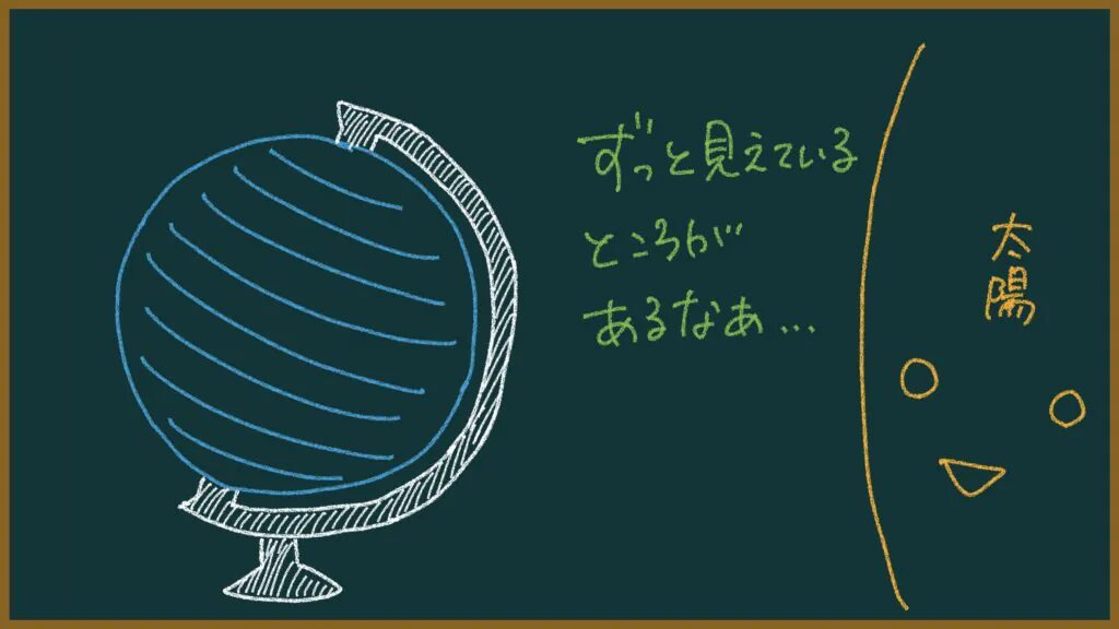 このように地球儀を持って地球を自転させてみると、太陽である自分からずっと見えている地域がある!ってことが確認できます。