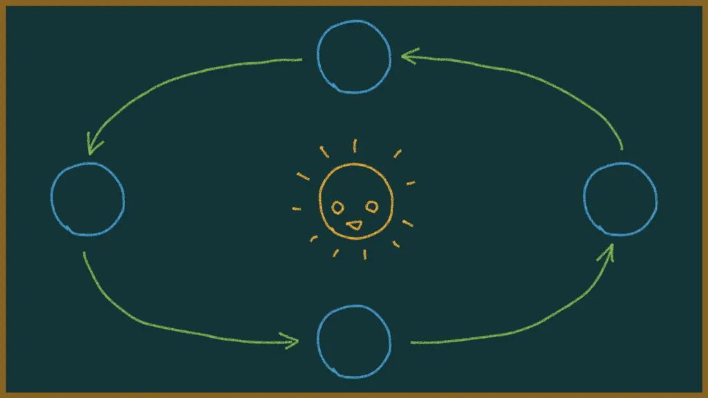 地球は、約1年(365日)かけて太陽の周りを回っています。この運動を公転(こうてん)と言います。