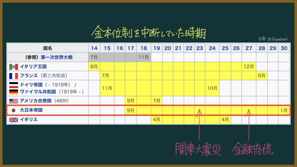 →ってことで、第一次世界大戦が始まった後、欧米諸国は金本位制を中断しました。で、日本も1917年9月に金本位制から離脱。