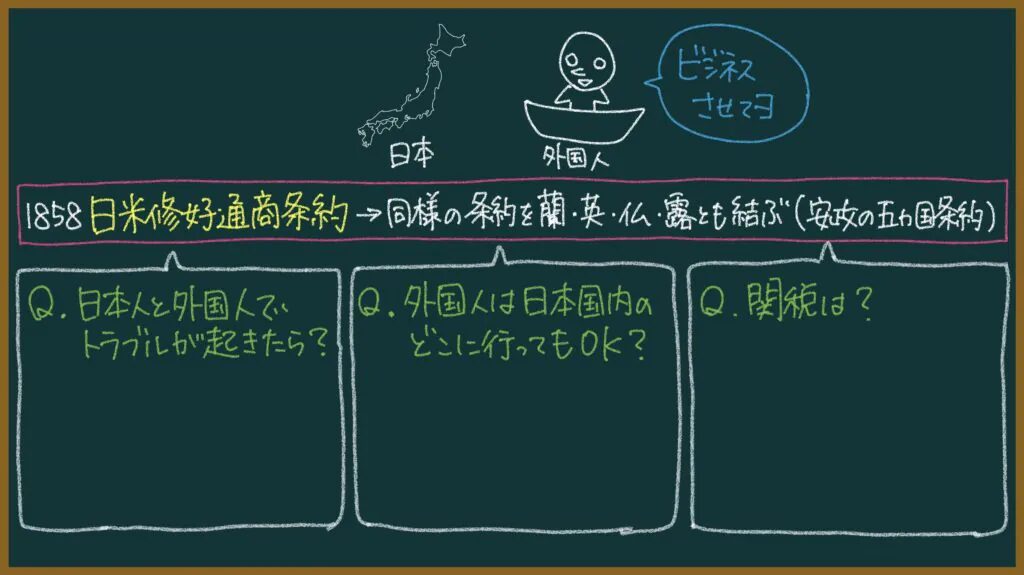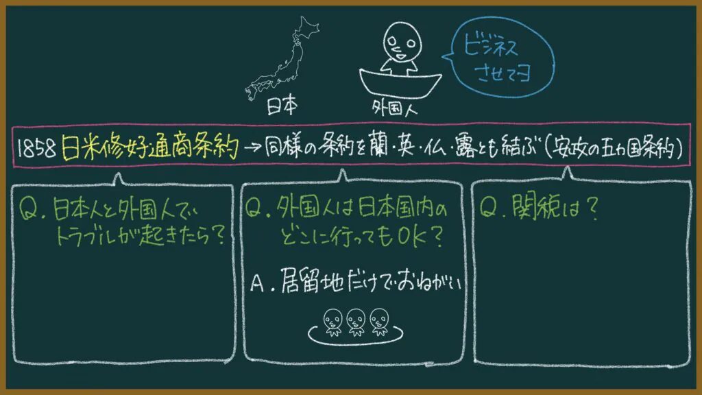 この点については、「港などの限られた場所に居留地を作るので、欧米人の居住・商売は居留地だけでお願いします」ってことになりました。