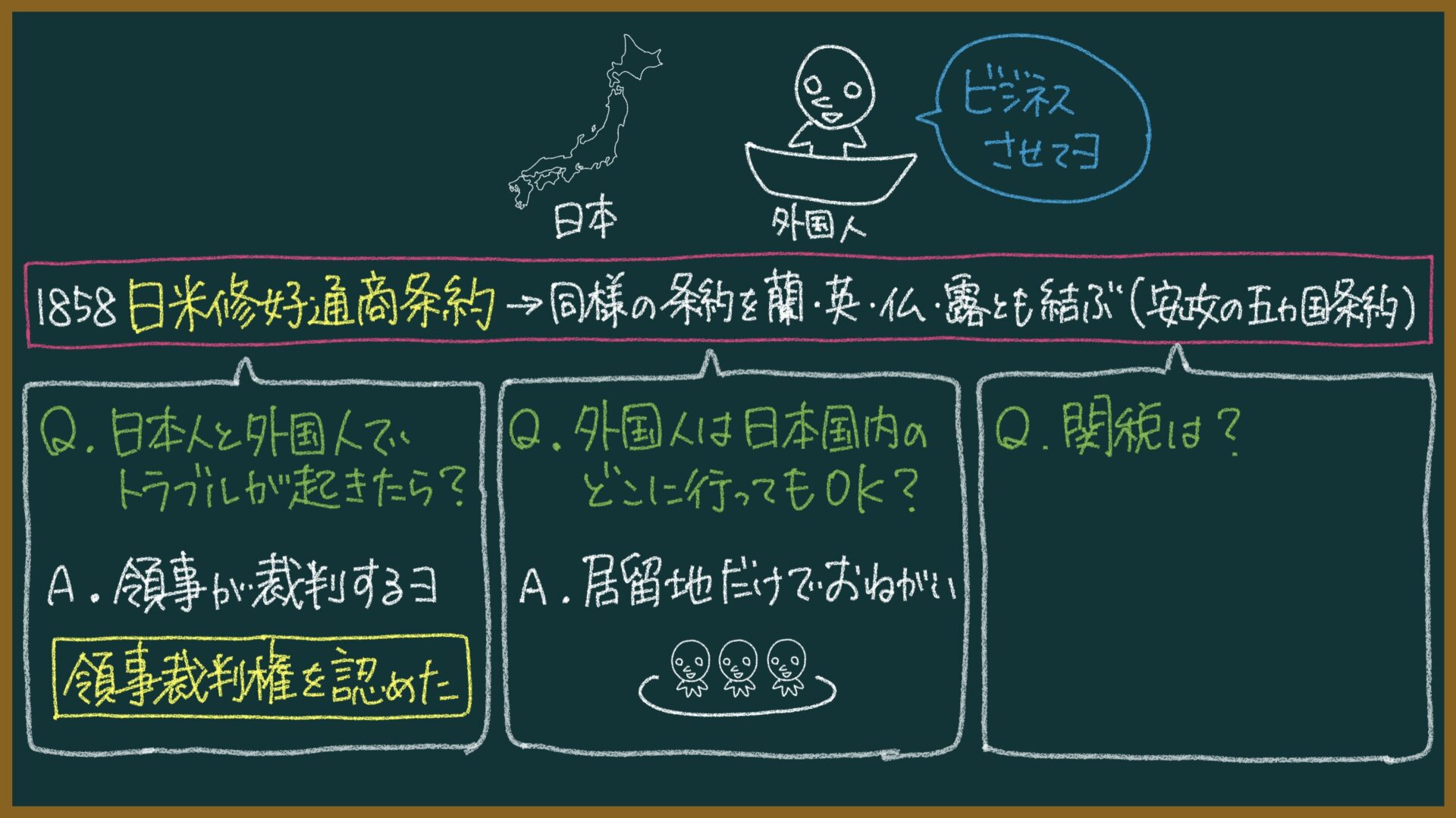 これが領事裁判権。日米修好通商条約(安政の五カ国条約)が「不平等」条約を言われる理由の1つです。