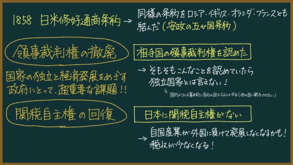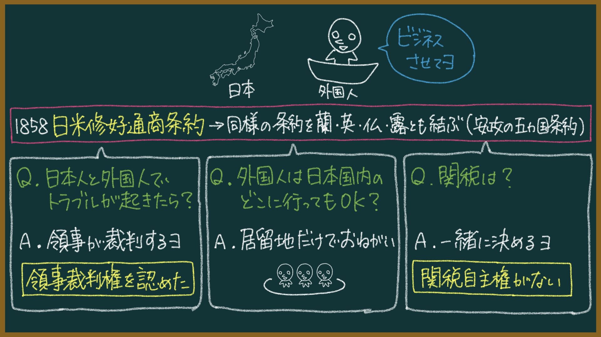 これが「完全自主権がない」ということ。日米修好通商条約(安政の五カ国条約)が「不平等」条約を言われる理由の1つです。
