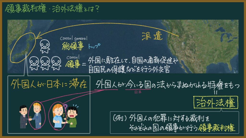 ※領事=外国にいて、自国民の保護・商売の促進を担当する外交官(例えば、アメリカ人外交官が日本に来て、日本国内のアメリカ人の保護や商売に関する仕事をする)