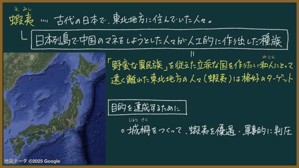 文化も見た目も異なる東北地方の人々は、「野蛮な異民族を従えた立派な国家」を作りたい和人にとって格好の存在だった。そこで和人は、東北地方の人々を「蝦夷」と呼び、異民族(夷狄)として設定したのである。実際に和人と人種的に異なる存在だったのか?は不明だが。