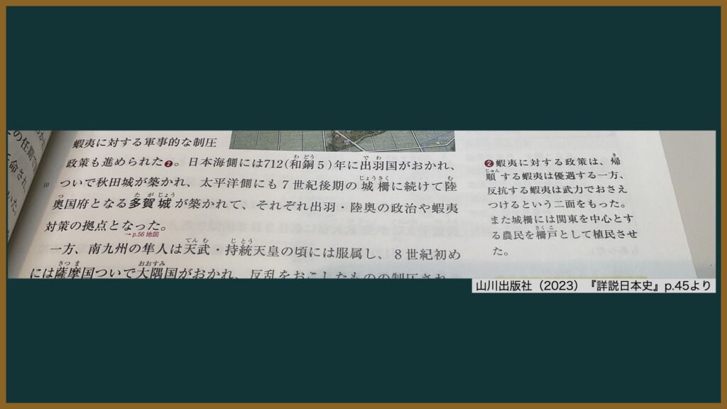 日本史の教科書を読むと、蝦夷を武力で従わせた(「蝦夷征討」)イメージばかり抱きがちだが、実際には強制的に従わせるだけでなく接待していた、ということ。このことも重要。