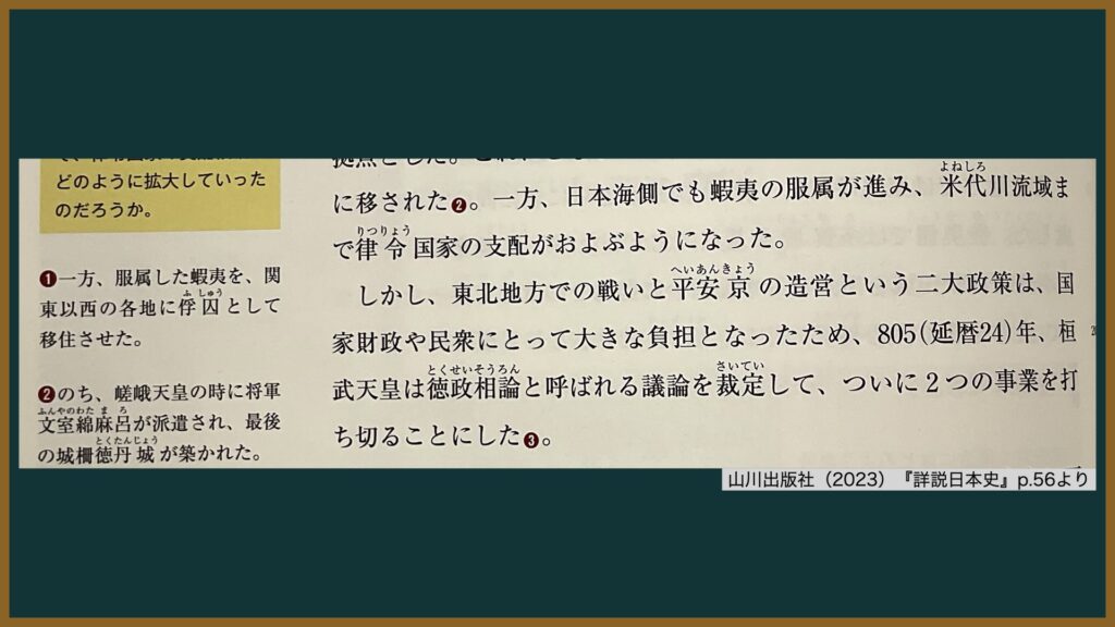桓武天皇の時代の805年、徳政相論(とくせいそうろん※)と呼ばれるディベートが行われ、激論の末に「東北地方での戦い」を打ち切ることが決定された(これ以上の大規模な侵攻=征夷を止めた)のである。