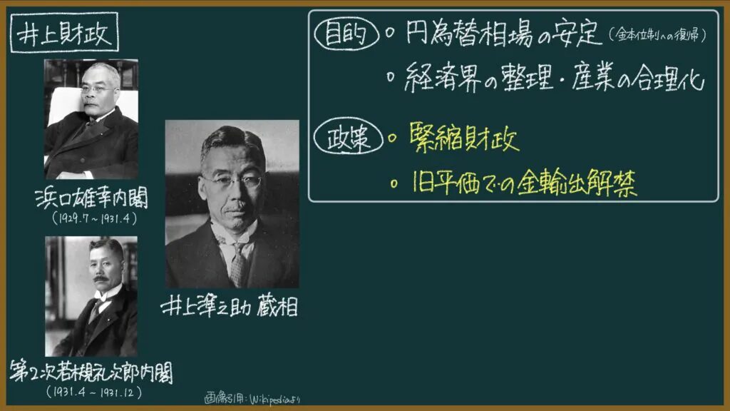 浜口雄幸内閣(1929年7月~1931年4月)と第2次若槻礼次郎内閣(1931年4月~1931年12月)で大蔵大臣を務めた井上準之助が行った財政政策のこと。