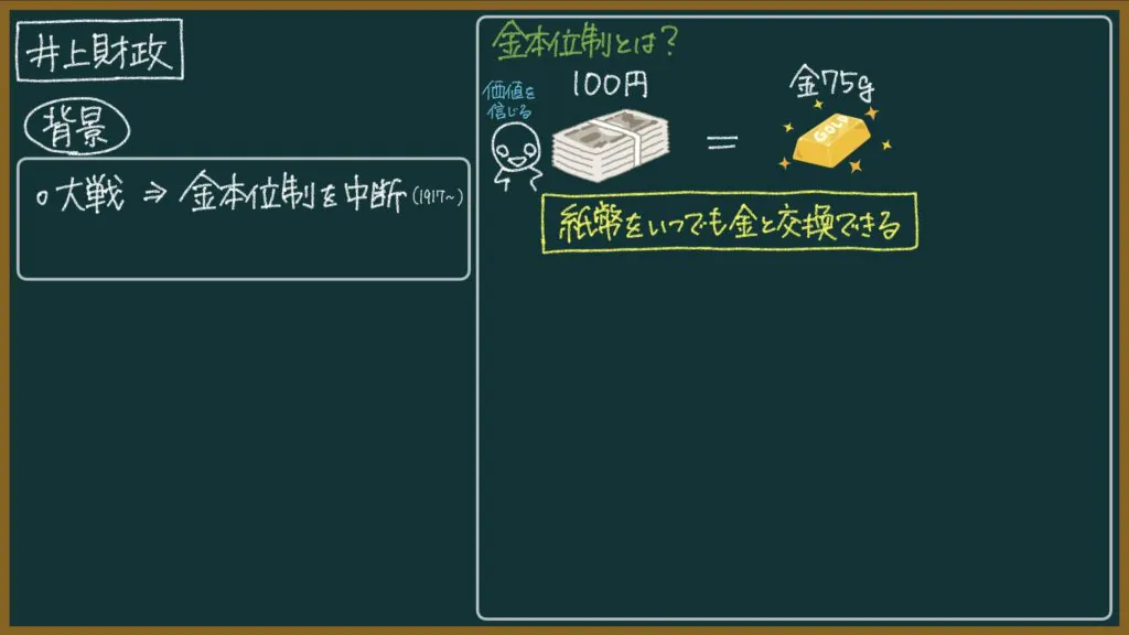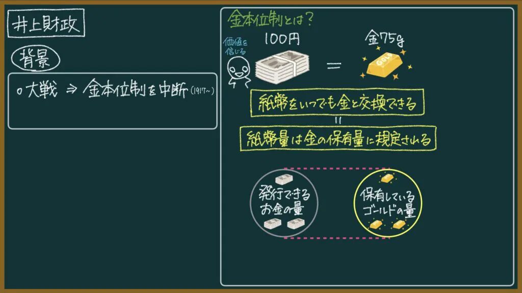 井上財政が始まる前は「発行できるお金の量(=金の保有量)」よりも多くのお金が市場に出回っていたので、金本位制に復帰するためには市場に出回っているお金の量を減らさなければいけません。