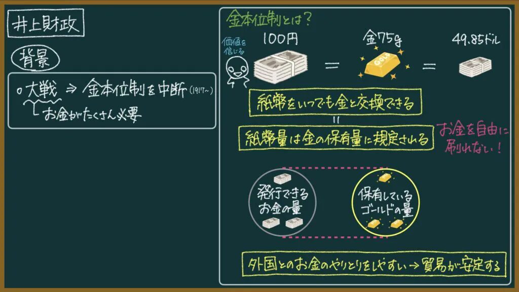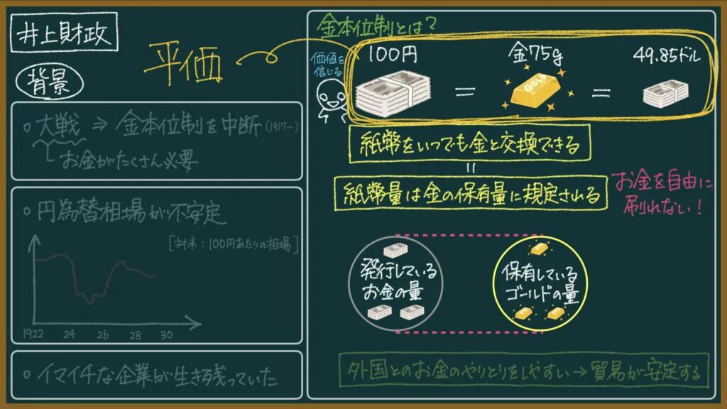 実際、日本は金本位制に復帰できていなかったので、外国とのお金のやり取りがしにくい状況(貿易をやりにくい状況)になっていました。