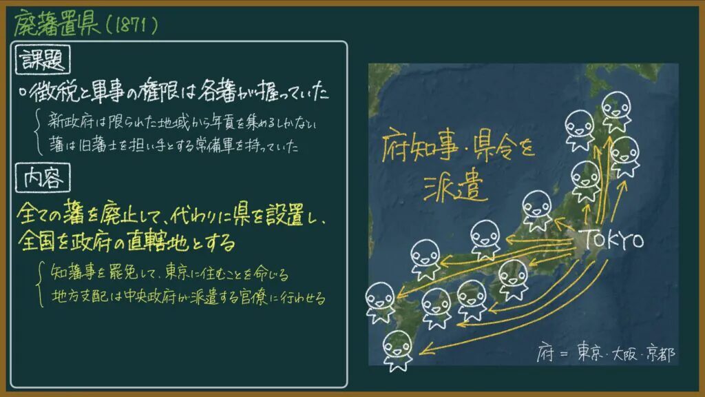 廃藩置県は「全ての藩を廃止して、代わりに県を設置し、全国を政府の直轄地とする」政策です。