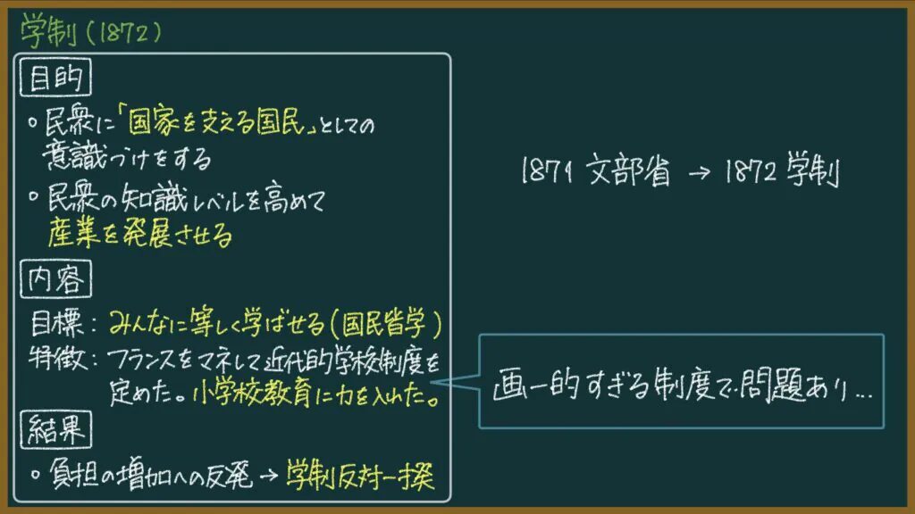 | 内容 | 身分や性別によらず、みんなに等しく学ばせること(国民皆学教育)を目指して、フランスの学校制度をマネして、近代的学校制度を定めた(特に小学校教育に力を入れた) |