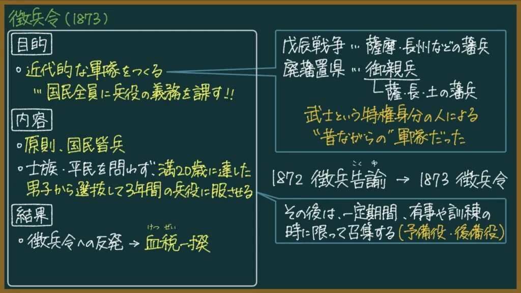 | 内容 | ・国民皆兵を原則 ・士族・平民を問わず、満20歳に達した男性から選抜して3年間の兵役に服させる ・3年間兵役に服した後は、一定期間、有事や訓練の時に限って召集する(予備役・後備役) |
