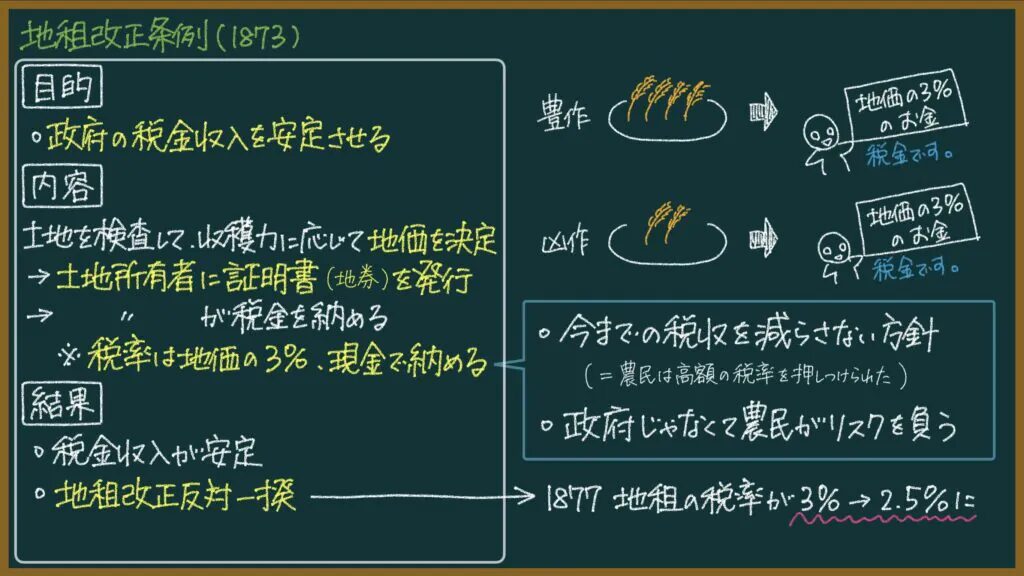 | 結果 | ・税金収入が安定し、政府は計画的な予算を組めるようになった ・地租改正反対一揆が起きた ・封建的領有制が解体した |