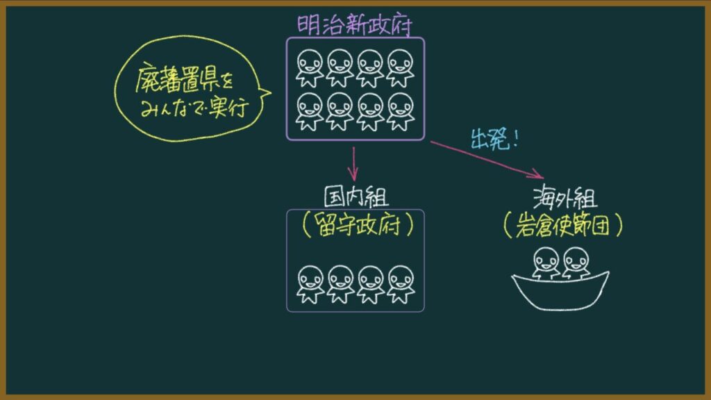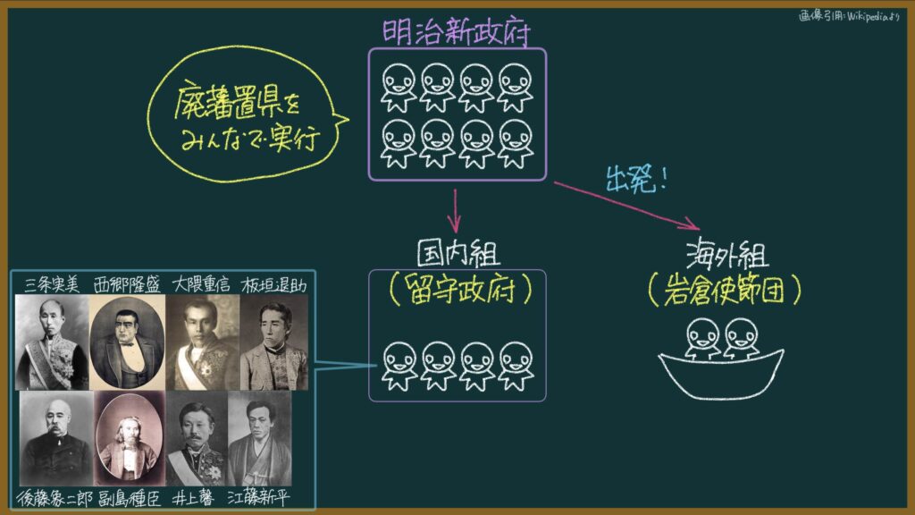 海外組は、岩倉具視を大使とする岩倉使節団です。よく教科書に写真が載っているやつですね。