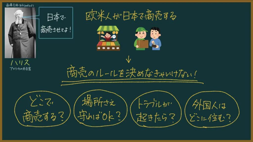 これらのルールが書かれているのが日米修好通商条約(安政の五カ国条約)です。
