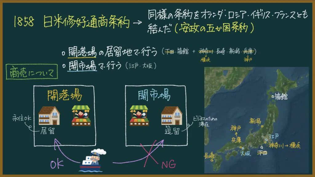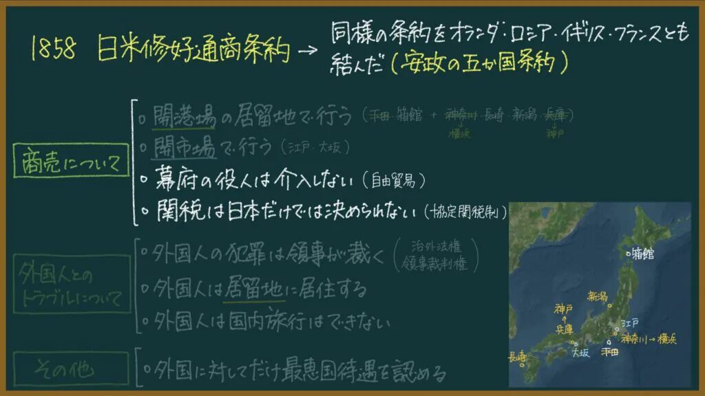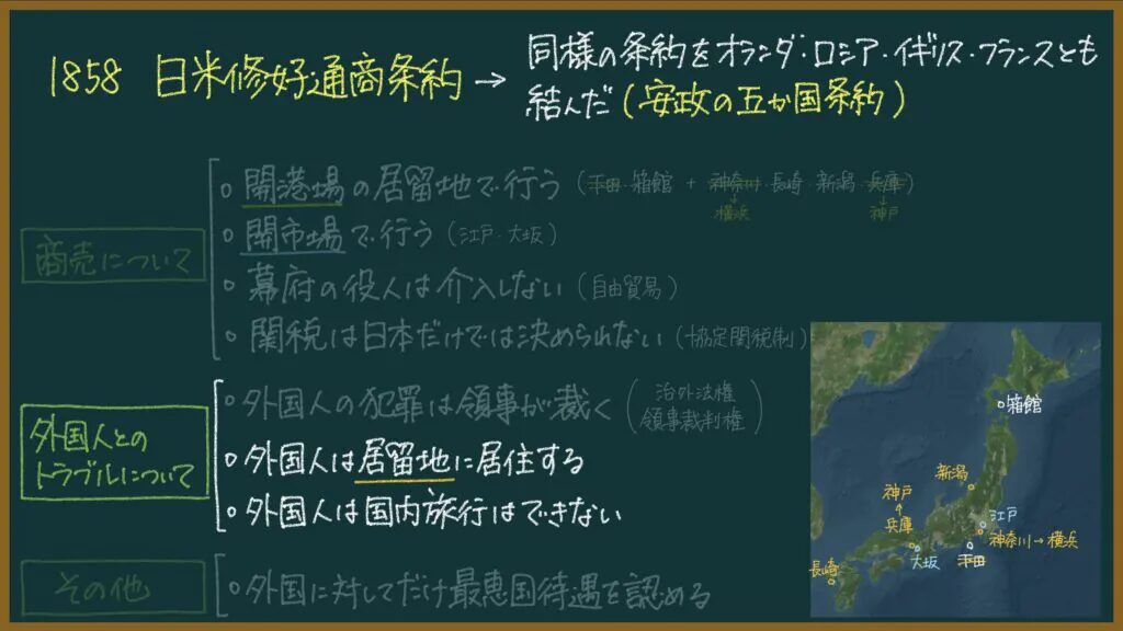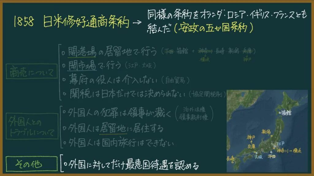 安政の五カ国条約(日米修好通商条約)は一言で言うと、「欧米人が日本で商売してもOK」っていうことを認めた条約です。