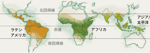 コーヒー豆の原料となるコーヒーノキは、「コーヒーベルト」と呼ばれる特定のエリア(赤道を挟んで北緯25度から南緯25度までの一帯)で栽培される。スタバに行くと壁に世界地図が描かれていることがあるが、これはコーヒーベルトの地図。
